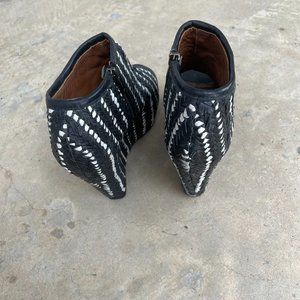 Super fun, editorial statement shoes from Zara. These are in a black & white woven leather, with a thick hidden platform wedge bottom. Peep toe. Gently worn and no signs of wear above sole. No box or dustbag. Size 40, approximate 9.5/10