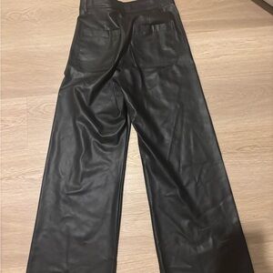 Sleek black wide leg pants. Faux leather finish. Front pockets. Button closure.