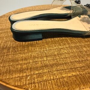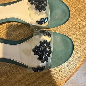 Chic slide sandals with black embellishments. Green footbed adds a stylish touch. Ideal for casual outings.