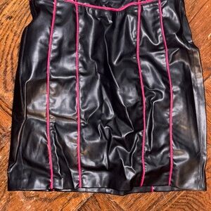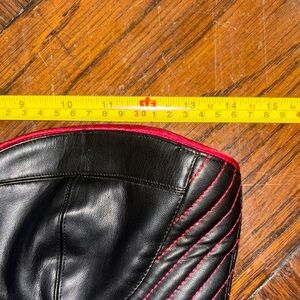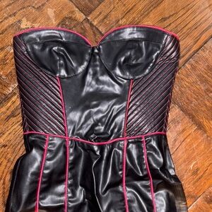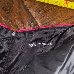 This captivating bodycon mini dress from Zara showcases a strapless sweetheart neckline, perfect for a night out. The sleek black design is enhanced with bold red accents, creating a striking contrast. Its fitted silhouette and glossy finish add a touch of sophistication and allure.