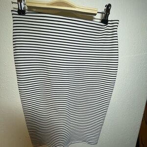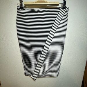 This knee-length pencil skirt from Zara features a striking black and white stripe pattern with an asymmetrical wrap front, perfect for both work and cocktail occasions. The form-fitting design ensures comfort and style, making it a versatile addition to any wardrobe.