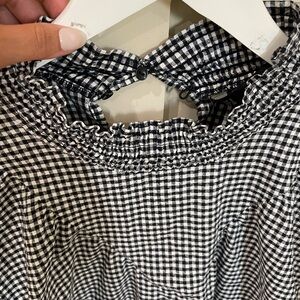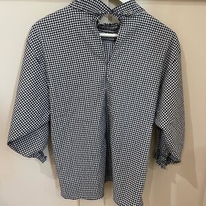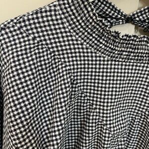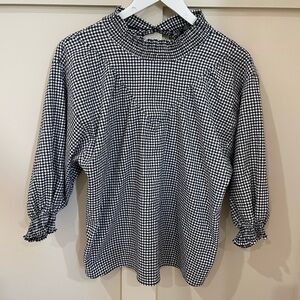 Chic black and white gingham blouse with ruffled collar and sleeves size small.