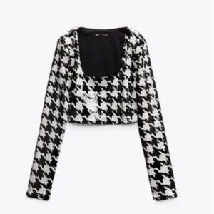 Stylish houndstooth pattern. Long sleeves. Perfect for chic outings.
