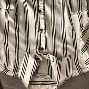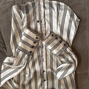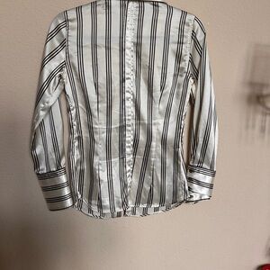 Elegant blouse with black stripes. Button-up front. Long sleeves with buttoned cuffs. Classic collar design.