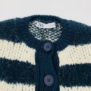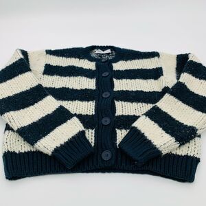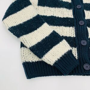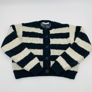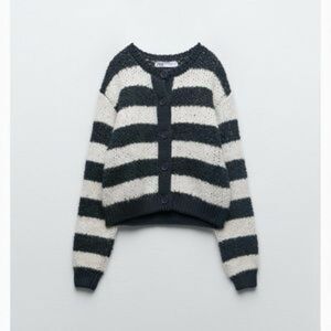 Stylish black and white striped cardigan. Button-up front. Cozy and chic design.