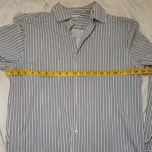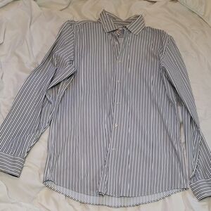 Stylish black and white stripes. Classic button-up design. Ideal for formal or casual wear. Very dark navy blue with light grayish stripe. SLIM FIT. Never worn. Smoke free, pet friendly home