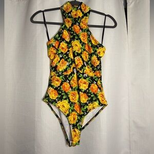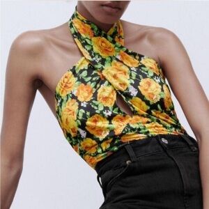 New Without Tags. Zara Black and Yellow Rose Cross Halter Neck Bodysuit. Black base with yellow and green rose floral print. Crossing neck halter top with keyhole in the front. Snap gusset. Size Small (could fit a Medium).