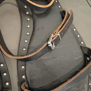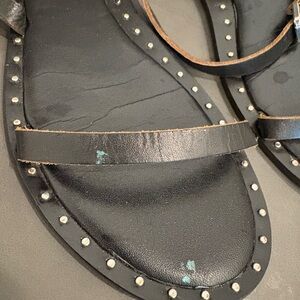 Elegant Zara sandals with studded accents. Black base with tan straps. Ideal for versatile styling.