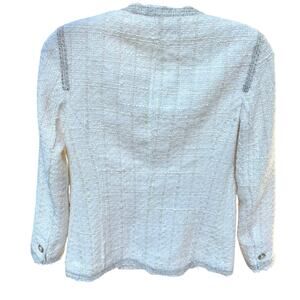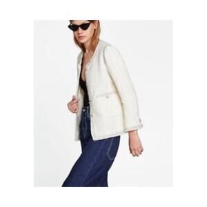 Zara Blazer Tweed Frayed Pearl Button Jacket Cream Silver Metallic Womens Sz XS