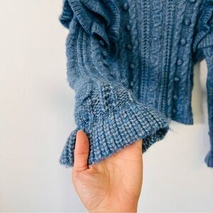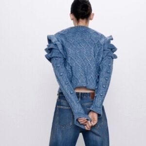 Zara Blogger Favorite Blue Pom Pom Ruffle Chunky Knit Sweater Large