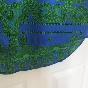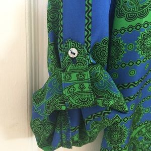 Zara blouse made in Morocco. Vibrant blue, green and black. Made of polyester but looks like silk. Sleeves roll up to mid-sleeve with a button strap. Back is slightly longer than the front by 2-3 inches.