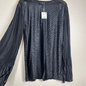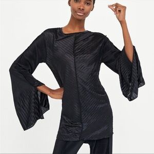Zara Blouse Contrasting Pleated Top Black Satin Bell Sleeves Women’s Size Large.