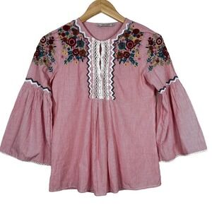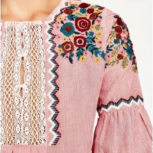 Zara Blouse Embroidered Bell Sleeve Stripe Beaded Crochet Red XS