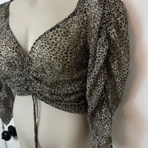 Zara Blouse Size Large Sheer Leopard Print Cropped V-Neck Ruched Bust Side Zip