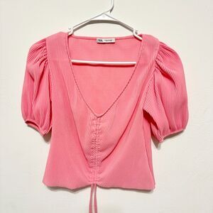 Zara Blouse Women Size Medium Puff Sleeve Cropped Ruffled Textured V Neck Barbie