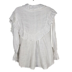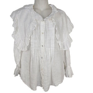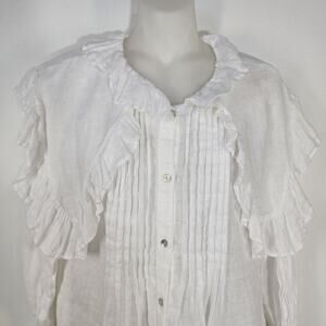 Zara Blouse XS 100% Linen Flounce White Peter Pan Collar Button Pleated Ruffles