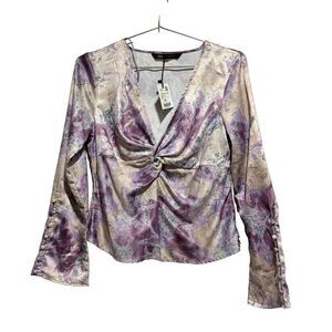 Zara Blouse lilac Pastle Watercolor S Abstract Twist Front V Neck Long Sleeve