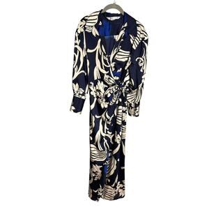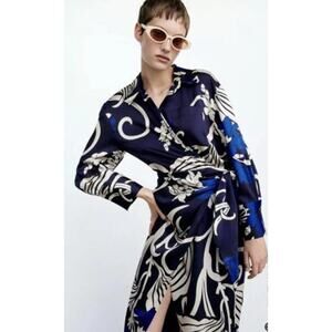 Zara Blue Abstract Satin Long Sleeve Maxi Wrap Dress Size Small