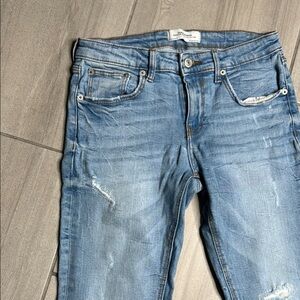 These Zara jeans feature a stylish ankle-cropped design in a classic blue hue, complete with a trendy distressed hem for an edgy look. The stretchy denim fabric ensures a comfortable fit, while the faded wash adds a casual, lived-in appeal.