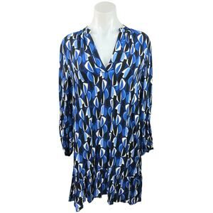 Zara Blue Black White Geometric V Neck Flowy Long Sleeve Mini Shift Shirt Dress Size M