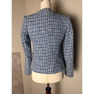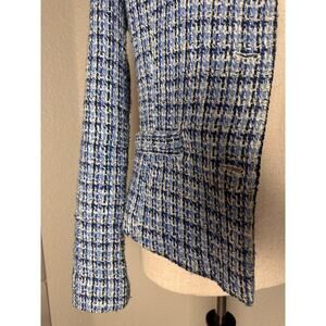This is women's textured weave jacket. It features a round neckline, long sleeves, and front patch pockets. The jacket is adorned with jewel button details and has a front metal hook closure. The color palette consists of shades of blue and white, creating a tweed-like appearance. It is a part of Zara's collection.