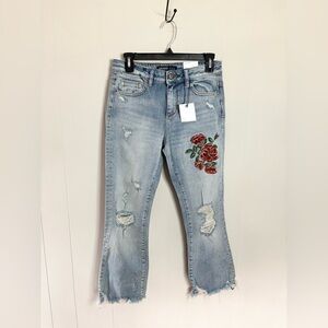 Stylish cropped jeans by Zara. Features red floral embroidery. Distressed details and frayed hems. Perfect for casual wear.