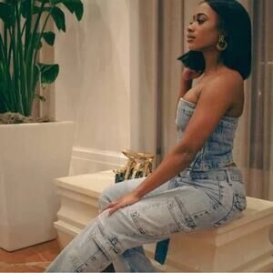 DENIM TOP CORSET BUSTIER Chic strapless denim top paired with matching jeans. Ideal for a trendy look.
