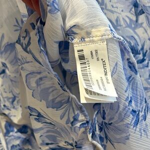 Sheer blouse with blue floral print. Ruffle trim along the yoke and neckline. Button-front closure and long sleeves. Lightweight and feminine styling.