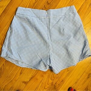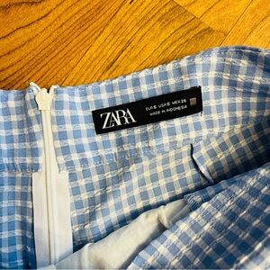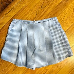 Elevate your style with this Zara blue gingham pleated skort (skirt + shorts combo) in size small. Featuring a light blue checkered pattern, flattering pleats, and built-in shorts for comfort and coverage.