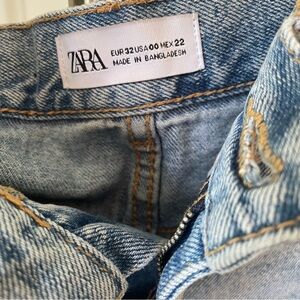 These Zara jean shorts feature a trendy distressed design with a frayed hem, crafted from a light to medium wash blue denim. The high-waisted cut offers a modern and casual look, perfect for everyday wear.