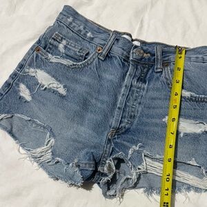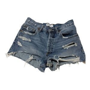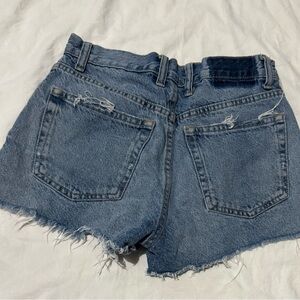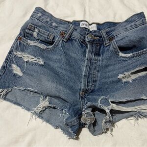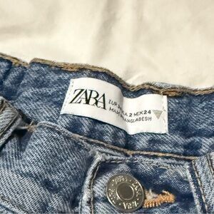 Embrace a laid-back vibe with Zara's blue jean shorts, featuring a distressed design and frayed edges for a vintage-inspired look. These shorts offer a comfortable fit with a raw, cut-off hemline, making them perfect for casual outings. The subtle distressing adds character, ensuring you stand out in style.