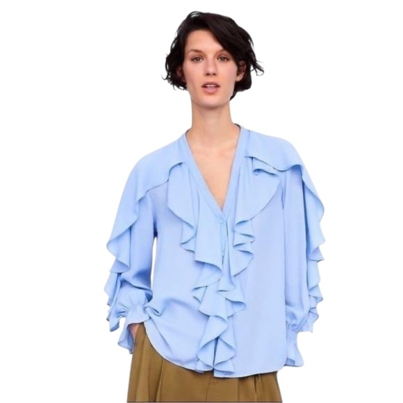 Zara Blue Long Sleeves Ruffle Blouse size XS