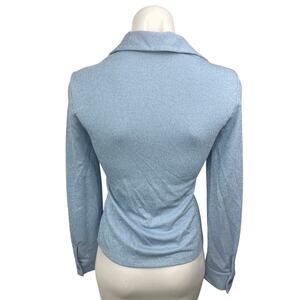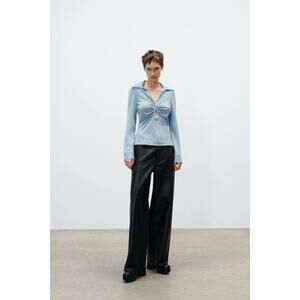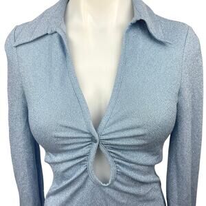 Zara Blue Metallic Ruched Keyhole V-neck Collar Long Sleeve Blouse Top Size XS