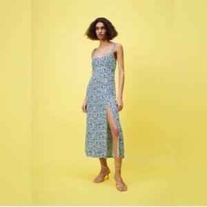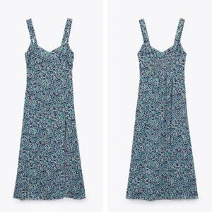 Zara Blue Micro Floral Slit Sleeveless Slip Midi Dress