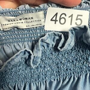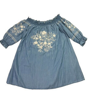 Chic mini dress by Zara. Features blue fabric with white floral embroidery. Off-shoulder design with ruffled edges. Reposhing because it’s a bit too big on me. So pretty and worn by Alexis Rose in Schitts Creek!