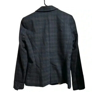 Trendy and classic blazer. Blue plaid. One button closure to front. Long sleeves.