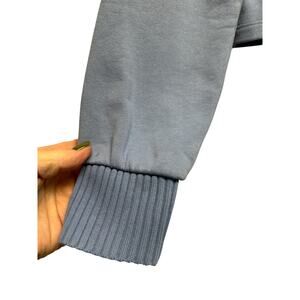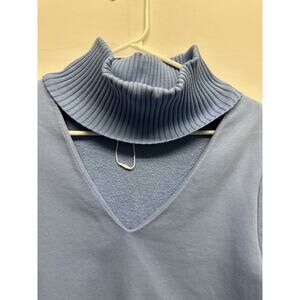Trendy and chic Zara sweatshirt-style top in a soft dusty blue color. Features a unique ribbed fold-over mock turtleneck with V-cut front detail, long sleeves with ribbed cuffs, and a slightly cropped silhouette. Made from 100% cotton for breathable comfort. A stylish twist on a classic sweatshirt that pairs perfectly with jeans, skirts, or layered looks.