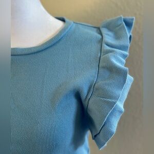Chic and feminine Zara ribbed knit crop top in a gorgeous muted blue. Features playful ruffled short sleeves, a crew neckline, and a fitted cropped cut that pairs perfectly with high-waisted jeans, skirts, or shorts. Lightweight with just the right amount of stretch for a flattering fit.