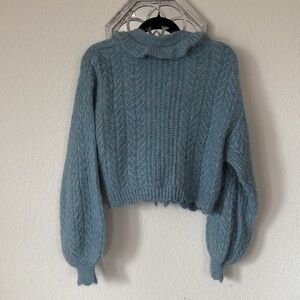 Elegant blue cardigan with ruffled front. Features cable knit design. Perfect for layering.