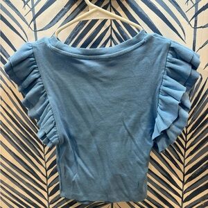 Stylish blue tee with ruffled sleeves. Ideal for casual wear.