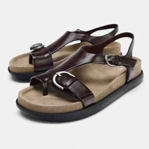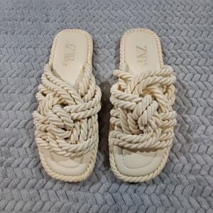 Experience comfort and style with Zara's blue sandals, featuring elegant bow details and a simple, classic design. Crafted from soft, flexible materials, these sandals are perfect for any casual occasion. Worn once like new