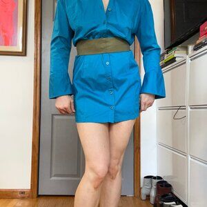 Button up shirt dress in electric blue color. Worn 1-2 times. 97% cotton / 3% elastane. Style DEN-582. I’m 5’8” so the dress comes right above the knees. Has a lot of good draping/corseting details so pairs great with a belt or a pair of bold heels. It's a little too big on me (I'm typically an 8 in Zara clothing). Lot's of good styling potential and just want to give this to the right home.