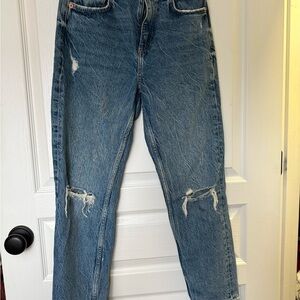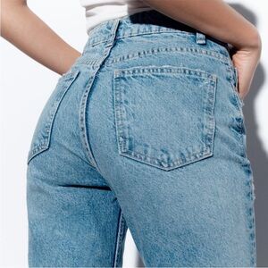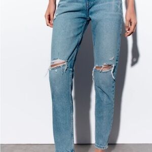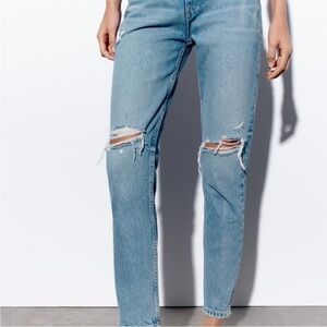 These Zara dark jeans feature a classic blue hue with a straight-leg cut, offering a timeless and versatile style. The distressed details at the knees add a trendy, casual touch, making them perfect for everyday wear. With a vintage-inspired wash, these jeans provide a comfortable and stylish fit.