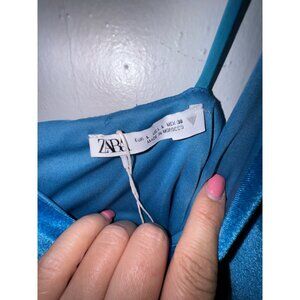 Zara Blue Velvet Spaghetti Strap Midi Dress in size Large. Features rhinestone detailing and stretchy material for a sexy, comfortable fit.
