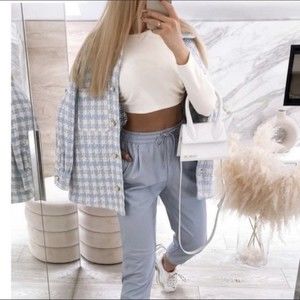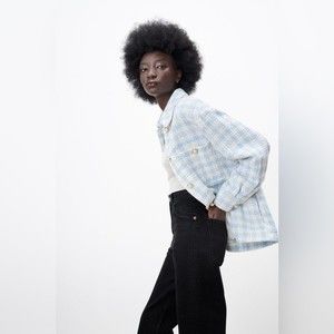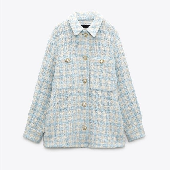 Zara Blue White Houndstooth Tweed Pearl Jewel Button Overshirt Shacket Jacket M