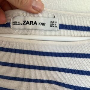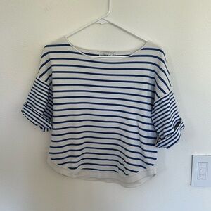 Cute and classic Zara blue and white striped top with a timeless preppy vibe. Features a flattering boat neckline, rolled sleeves, and cropped length—perfect for pairing with high-waisted jeans or shorts for a nautical-inspired look.