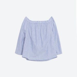 A blue & white striped long sleeve off the shoulder Zara shirt.