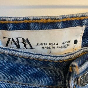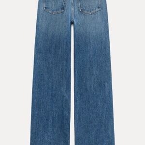 These Zara jeans showcase a chic wide-leg silhouette that flares from the knee, made from a classic blue denim fabric. The mid-rise design provides comfort, while the full-length cut adds versatility to your wardrobe.