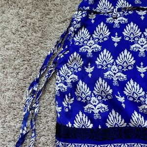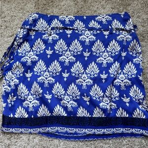 Stylish asymmetrical skirt. Features bold blue and white pattern. Perfect for a chic look.