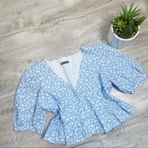 Zara Blue and White Floral Puff Sleeve Summer Womens Peplum Blouse